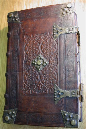 Der gut erhaltene Einband hat eine Größe von 35 x 23 x 8,5 cm, die Holzdeckel sind 8 mm dick, er ist auf 4 Doppelbünde genäht und mit naturfarbenem Kalbsleder bezogen. Der Vorder- und der Hinterdeckel sind gleich gestaltet. In Blindprägung wird mit der St.-Michael-Rolle ein von Streicheisenlinien begrenzter äußerer Rahmen gebildet und im Innenfeld die Rautenplatte S-S 6 b viermal verwendet.