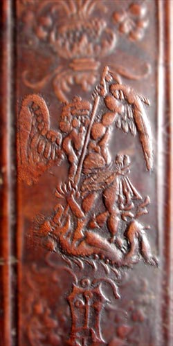 Die St.Michael-Rolle zeigt den Erzengel aufrecht auf Luzifer stehend und ihn mit einer Lanze durchbohrend. Er trägt ein um die Hüften gebundenes Tuch. Bei der Darstellung fallen vor allen Dingen die detailreiche Ausarbeitung der Flügel und der Muskeln auf. Luzifer hat den Rachen weit aufgerissen und streckt einen Arm abwehrend nach oben. Unter ihm ist auf einem Schild das Wappen, die von den Michaelisbrüdern zuerst benutzte Druckermarke des Kreuzes auf der dreigeteilten Weltkugel ( für die damals drei bekannten Erdteile Europa, Afrika und Asien ) geprägt.