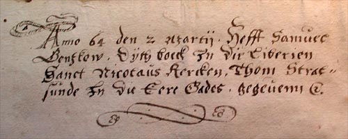 „ Anno 64 den 2.Martii Hefft Samuel Benzkow Dyth boeck In Die Liberien
